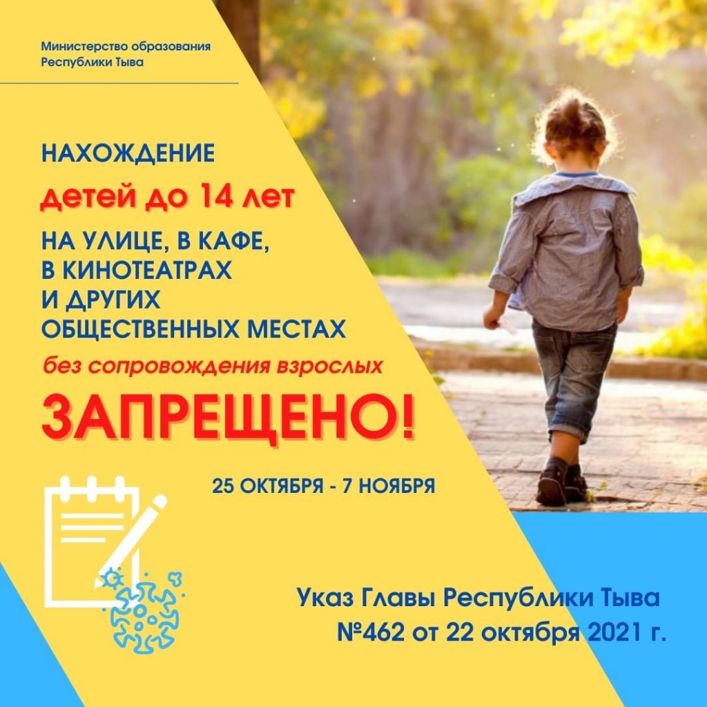 Новости Уважаемые родители (законные представители)! 25.10.2021 / С 25 октября по 07 ноября 2021 года по Указу Главы Республики Тыва №462 от 22.10.2021г. нахождение несовершеннолетних до 14 лет, без сопровождения взрослых, на улицах, в общественных местах, в кафе, в кинотеатрах ЗАПРЕЩЕНО!